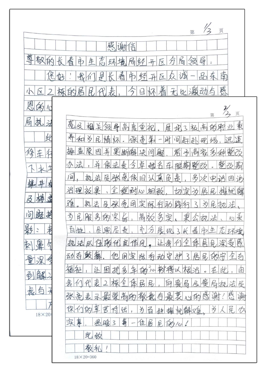 为确保整改措施落到实处,分局执法人员持续开展跟踪问效,对企业整改盯住不放,推动整改措施落地见效。他们多次深入现场,检查整改进度,及时与企业沟通解决整改过程中遇到的问题。同时,执法人员还及时向群众通报企业整改工作进展。在执法人员的督促指导下,企业如期完成整改任务,异味扰民问题得到彻底解决。社区居民对长春市生态环境局经开分局快速响应、高效解决百姓身边问题的工作效率和执法人员认真负责的服务态度表示高度的认可和真诚的感谢。3月24日,居民代表向经开分局赠送了锦旗和感谢信。
