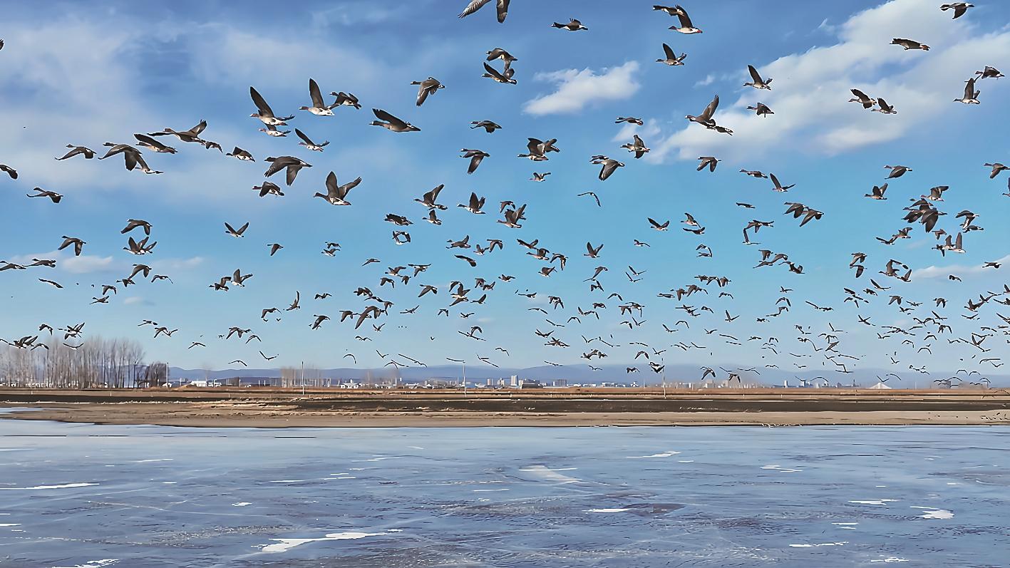 压题图片:珲春地处候鸟迁徙路线的关键节点,每年春秋两季都会有大量候鸟在此停歇、觅食。图为北归的大雁在珲春三家子满族乡上空飞翔。 孙琳 摄