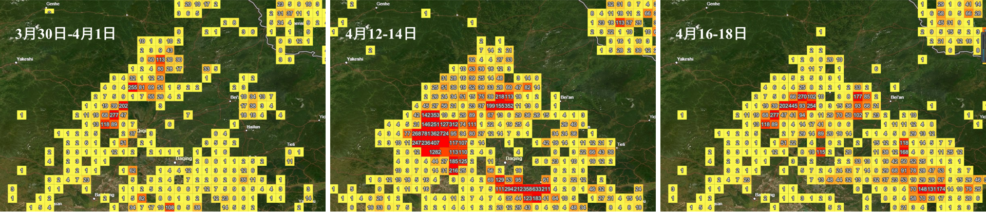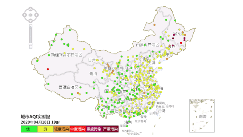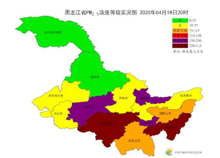东北地区中,又以黑龙江南部污染程度最重。截至4月18日20时,东北地区10个城市出现重污染天,齐齐哈尔、鸡西和绥化3个城市日均空气质量指数(AQI)“爆表”,PM2.5日均浓度峰值为807微克/立方米(齐齐哈尔,4月13日),达严重污染;哈尔滨等11个城市AQI“爆表”时长累计137小时,哈尔滨在4月18日9–10时PM2.5小时浓度超过2000微克/立方米。