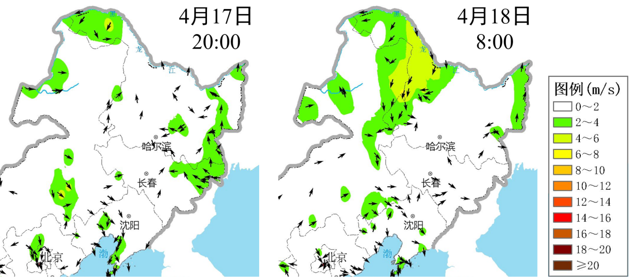 4月17–18日典型时刻东北地区风场实况