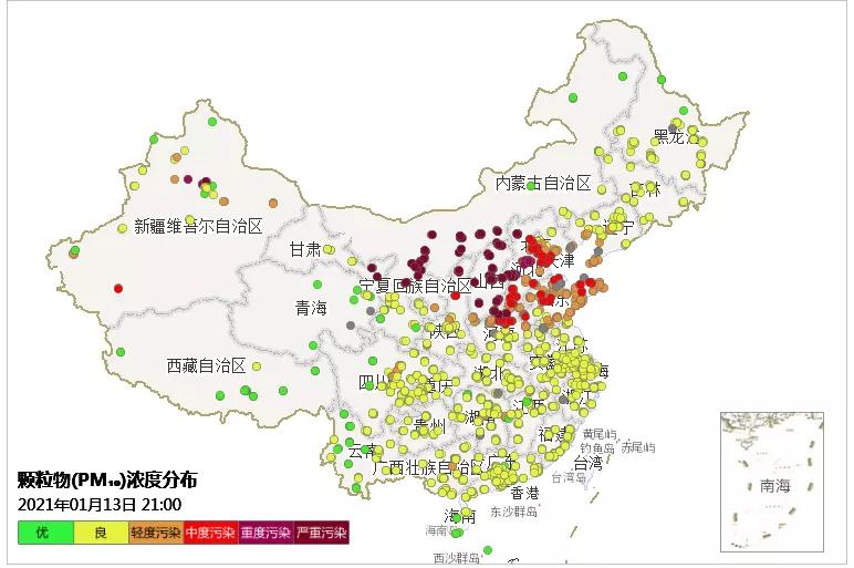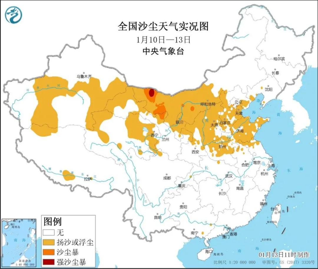 多个城市受沙尘影响出现空气质量指数“爆表”。1月10日中午前后起,受多股冷空气及其带来的大风影响,我国内蒙古西部、甘肃河西、宁夏等地出现沙尘天气。在较强西北气流作用下,携带高浓度沙尘的气团向东南方向移动,先后影响到陕西、山西、京津冀及周边地区和长三角地区北部。截至1月13日21时,全国337个地级及以上城市中,40个城市PM10日均浓度达中度及以上污染水平,蒙甘陕宁交界地区7个城市空气质量指数日均值“爆表”,PM10小时浓度在12日晚间至13日早晨一度超过2000微克/立方米;以榆林为例,污染峰值时段颗粒物钙离子等沙尘示踪组分浓度较沙尘天气之前升高20多倍。13日下午至夜间,太行山沿线城市普遍出现短时PM10重度或严重污染;北京市PM10浓度从12时的104微克/立方米快速上升至17时的353微克/立方米,达短时重度污染水平。