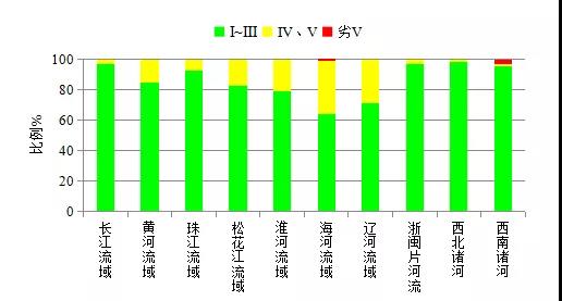 西北诸河、浙闽片河流、长江流域、西南诸河和珠江流域水质为优,黄河、松花江和淮河流域水质良好,辽河和海河流域为轻度污染。