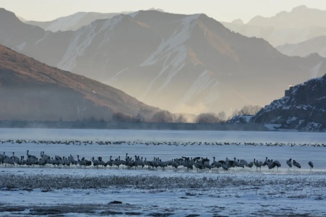 西藏藏南河谷湿地中越冬的黑颈鹤。(来源:生态环境部生物多样性保护重大工程项目)