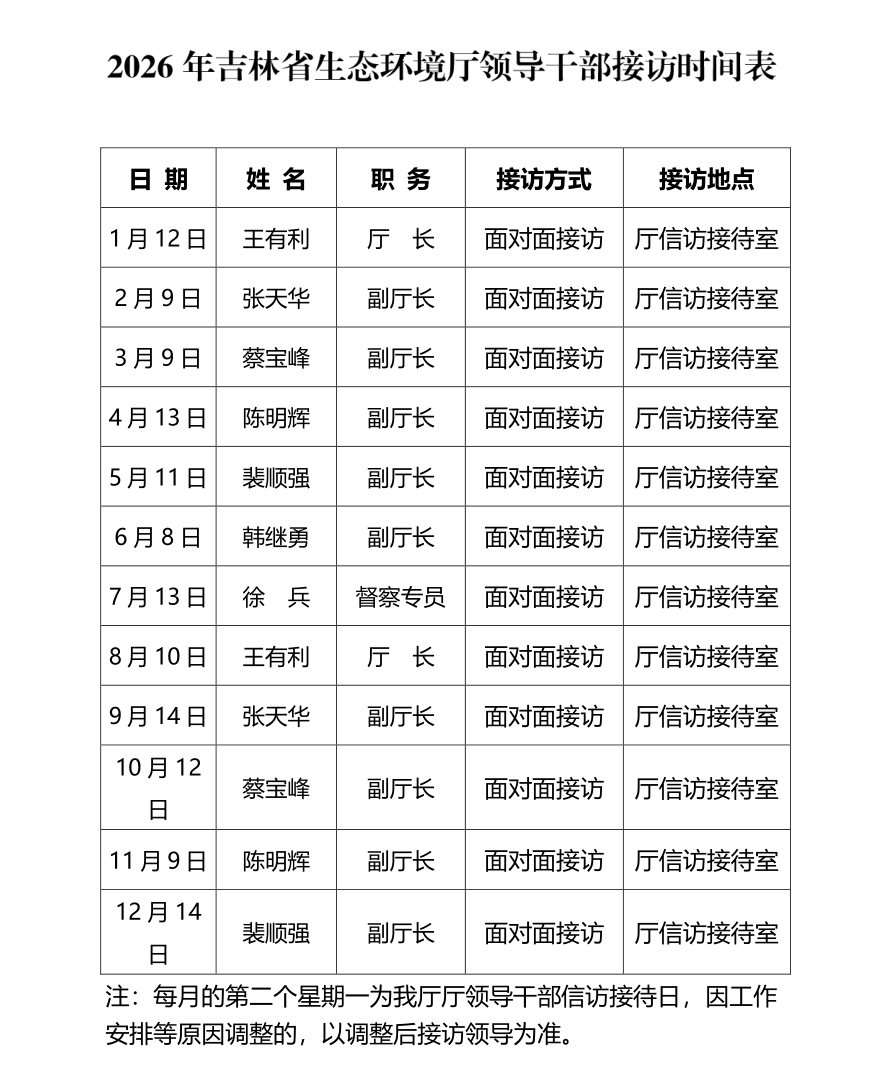 标 题:2026年吉林省生态环境厅领导干部接访时间表