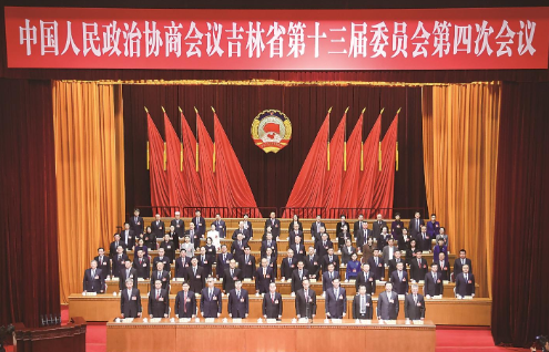 上午9时,吴靖平宣布政协吉林省第十三届委员会第四次会议开幕,全体委员起立,庄严的国歌响彻会场。