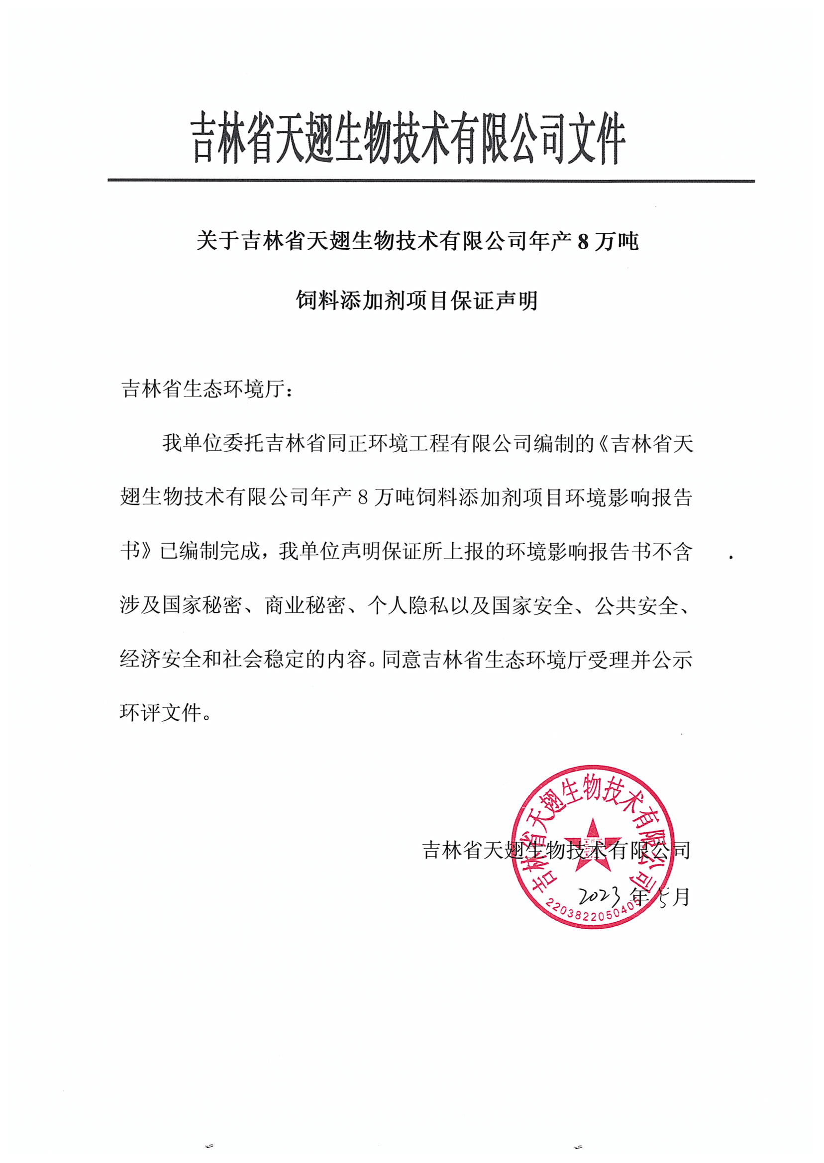 | 1吉林省天翅生物技术有限公司年产8万吨饲料添加剂项目(1).pdf 2审查申请.jpg 3保证声明.jpg 4附件 1公众参与说明 吉林省天翅生物技术有限公司年产8万吨饲料添加剂项目.pdf |