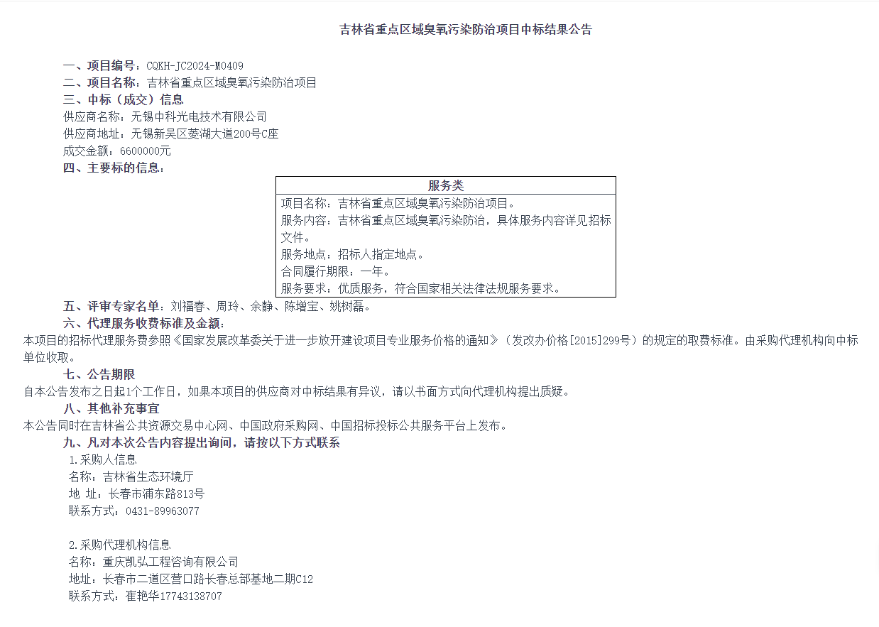 吉林省重点区域臭氧污染防治项目中标结果公告