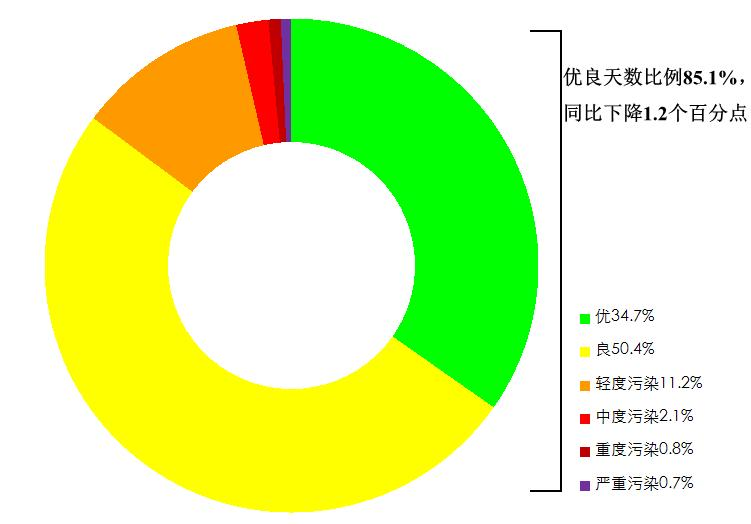 长三角地区41个城市10月平均优良天数比例为85.0%,同比下降9.8个百分点,较2019年同期上升1.2个百分点;未出现重度及以上污染天,同比持平,较2019年同期下降0.7个百分点;PM2.5平均浓度为32微克/立方米,同比上升39.1%,较2019年同期下降13.5%;O3平均浓度为162微克/立方米,同比上升18.2%,较2019年同期上升8.7%。1—10月,平均优良天数比例为83.3%,同比上升1.3个百分点,较2019年同期上升7.3个百分点;平均重度及以上污染天数比例为0.6%,同比上升0.5个百分点,较2019年同期下降0.1个百分点;PM2.5平均浓度为29微克/立方米,同比持平,较2019年同期下降25.6%;O3平均浓度为162微克/立方米,同比下降2.4%,较2019年同期下降4.1%。