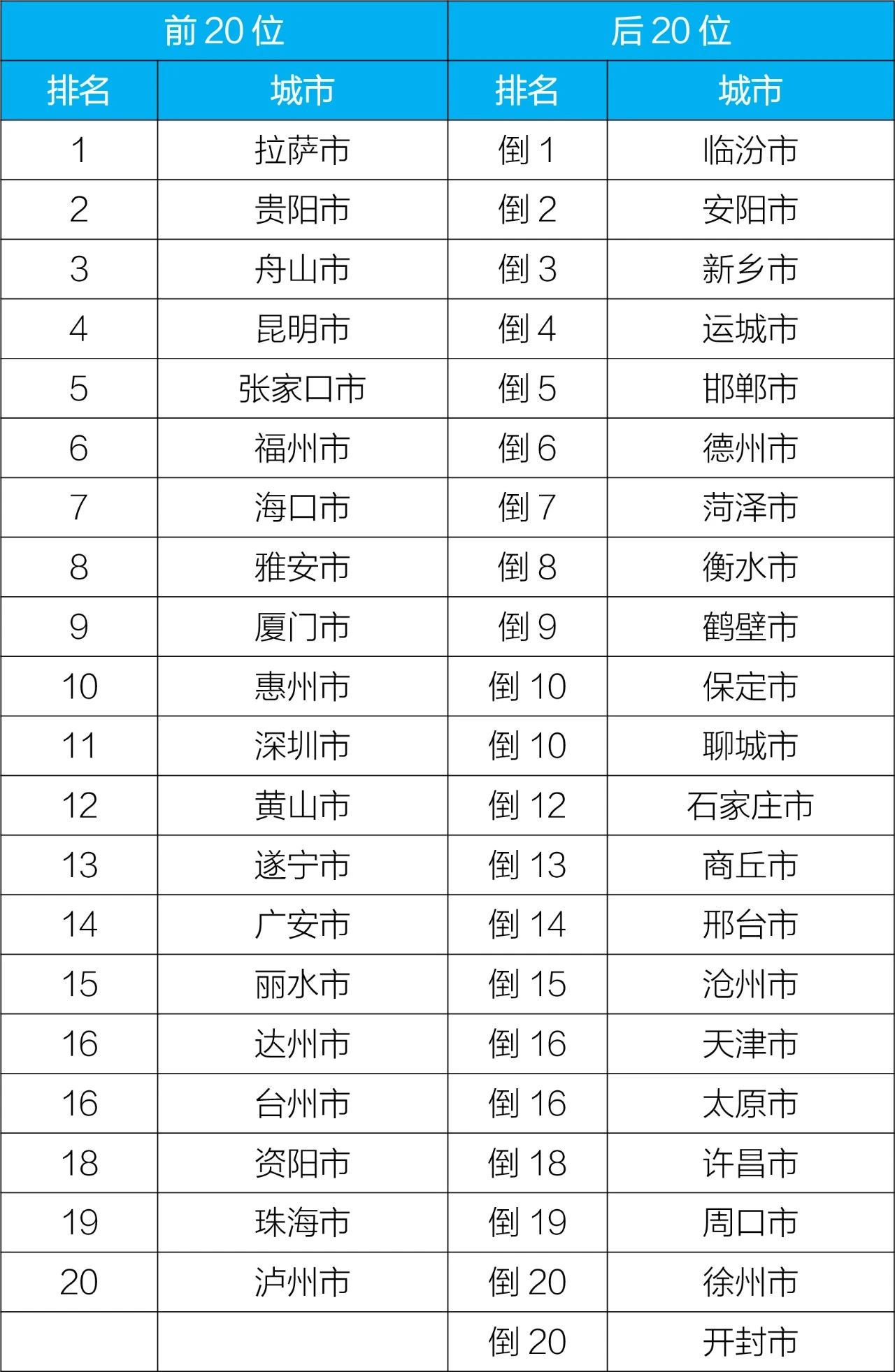 10月,168个重点城市中,空气质量排名前20位城市依次是拉萨、贵阳和舟山等城市(从第1名至第20名);空气质量排名后20位城市依次是临汾、安阳和新乡等城市(从倒数第1名至并列倒数第20名)。见附表1。