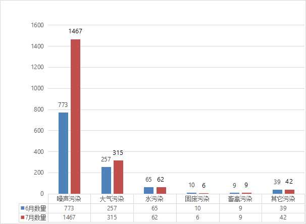 7月份,全省生态环境部门办理1897件生态环境问题信访投诉,已办结1843件,办结率约为97.15%,同比增长10.09%,环比增长64.87%。从污染类型分类情况来看,噪声污染问题1467件,占总数的77.17%(其中工业噪声205件、建设施工噪声96件、社会生活娱乐噪声1166件,分别占比13.97%、6.54%、79.48%);大气污染问题315件, 占总数的16.57%;水污染问题62件,占总数的3.26%;固废污染问题6件,占总数的0.32%;畜禽粪污问题9件,占总数的0.47%;其它污染问题42件,占总数的2.21%。